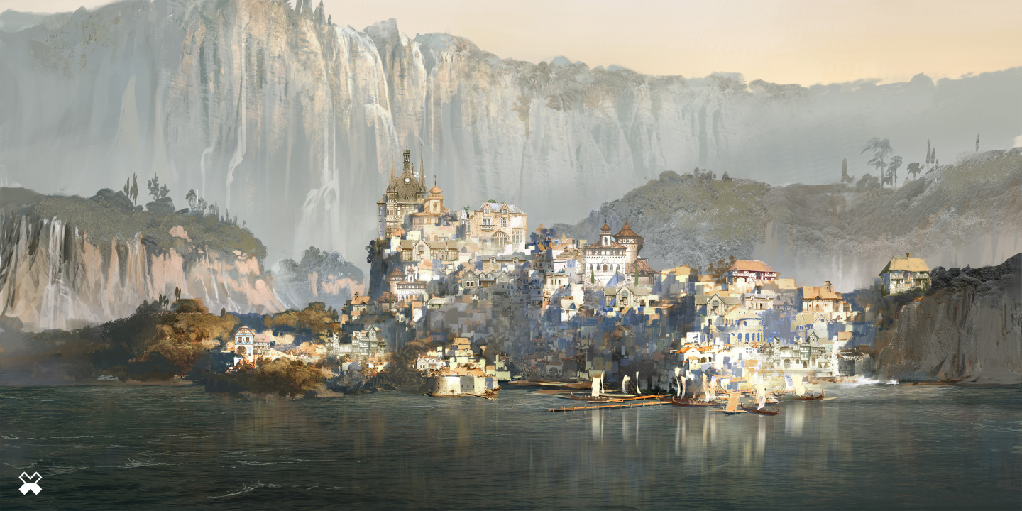 视觉、插图、山、城市、水、风景、长老卷轴、游戏CG