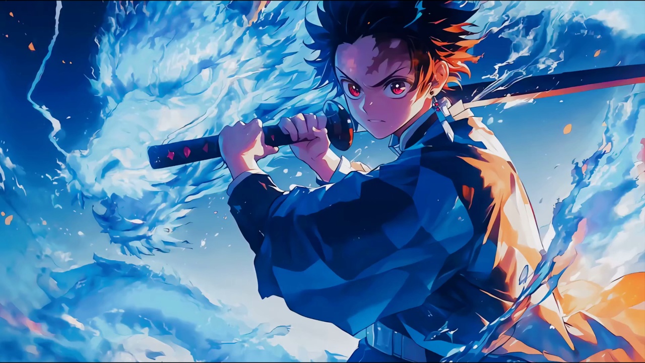 动漫、AI艺术、艺术作品、战斗、男孩、火、武士、恶魔、水之呼气、炭治郎、鬼灭之刃、鬼杀队、火之神神乐、神乐舞、灶门