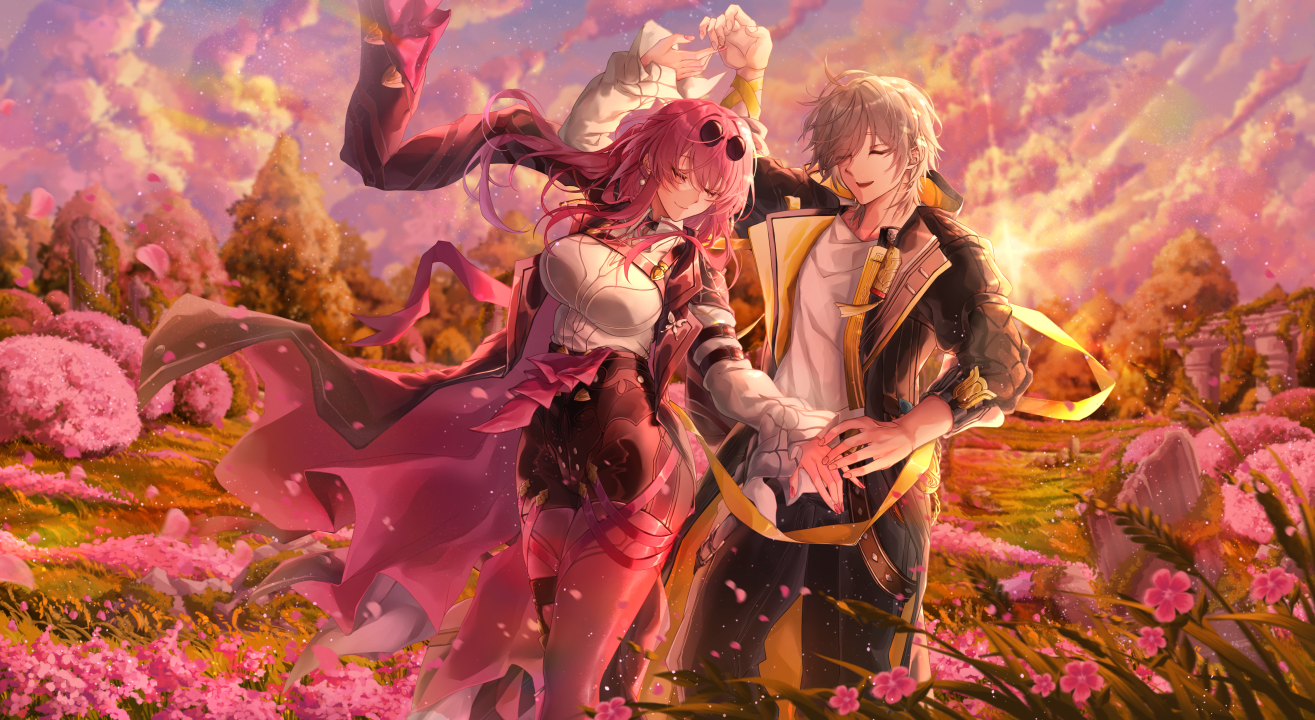 闭着眼睛、微笑、长发、动漫、动漫男孩、动漫女孩、舞蹈、天空、花瓣、云、花朵、叶子、阳光、日落