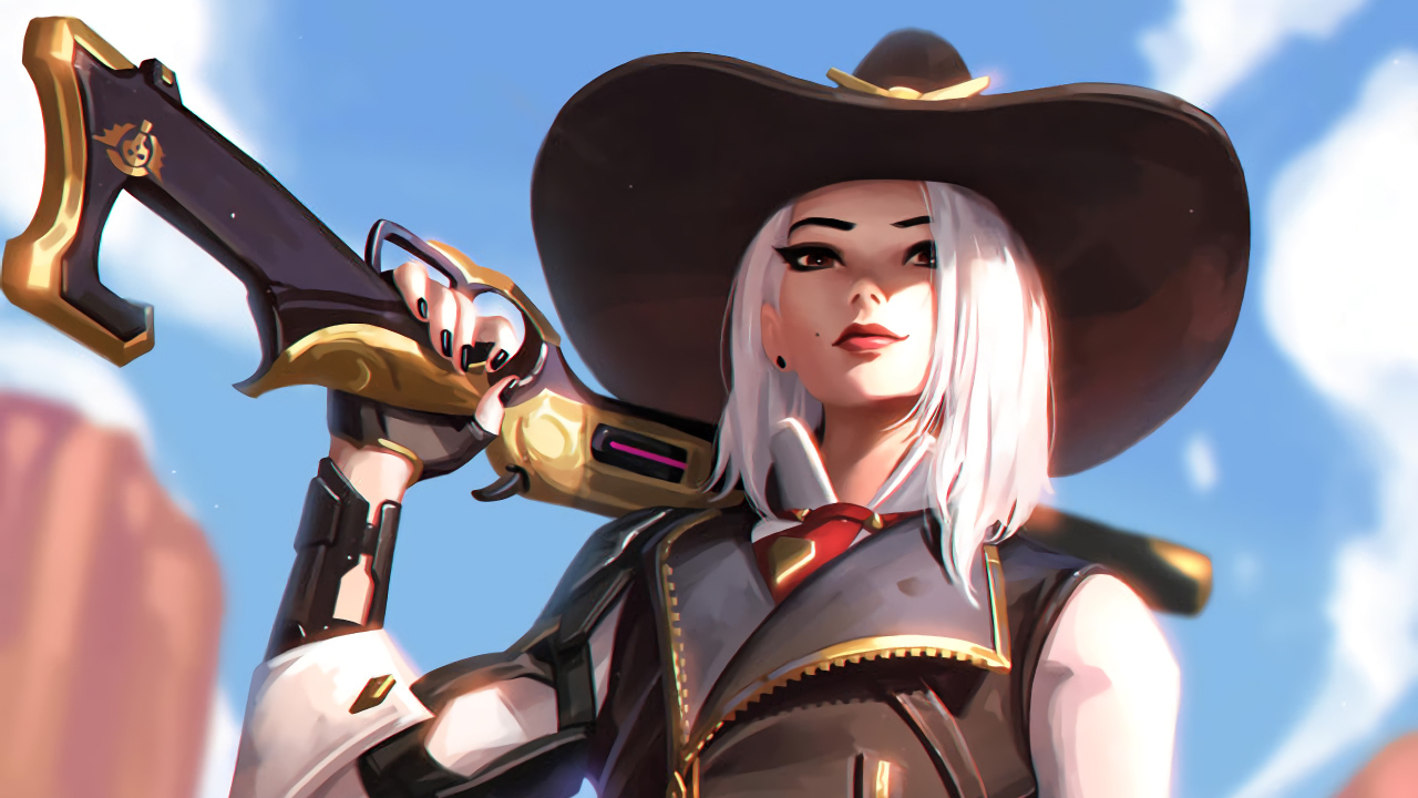 电子游戏女人、白发、AI艺术、守望先锋、插图、武器、猎枪、电脑游戏、牛仔帽、帽子、黑色指甲、红色口红