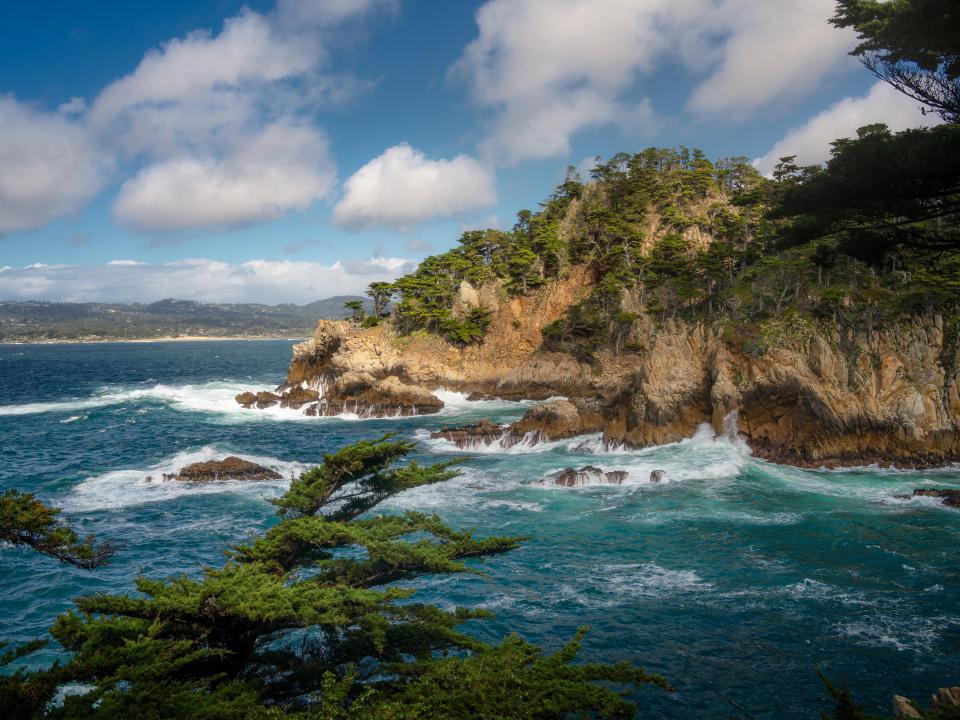 风景、海岸、悬崖、海、森林、柏树、云、自然