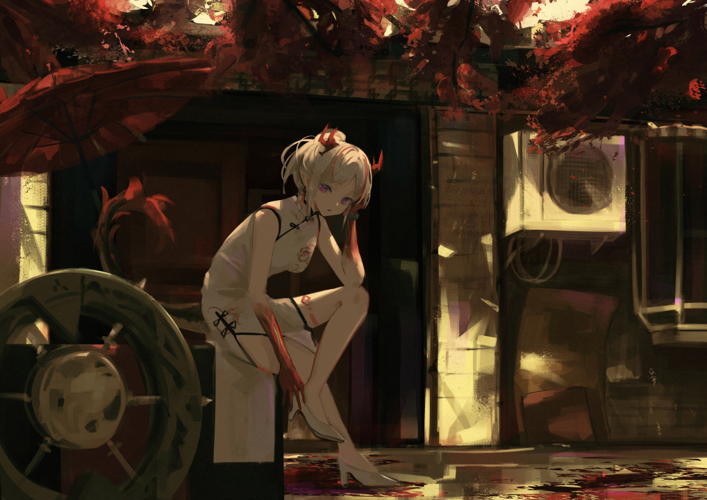 生活、白发、发髻、动漫、女孩、年、战士、角、紫色眼睛、兽耳、旗袍、汉服、雨伞、小巷、丸子头