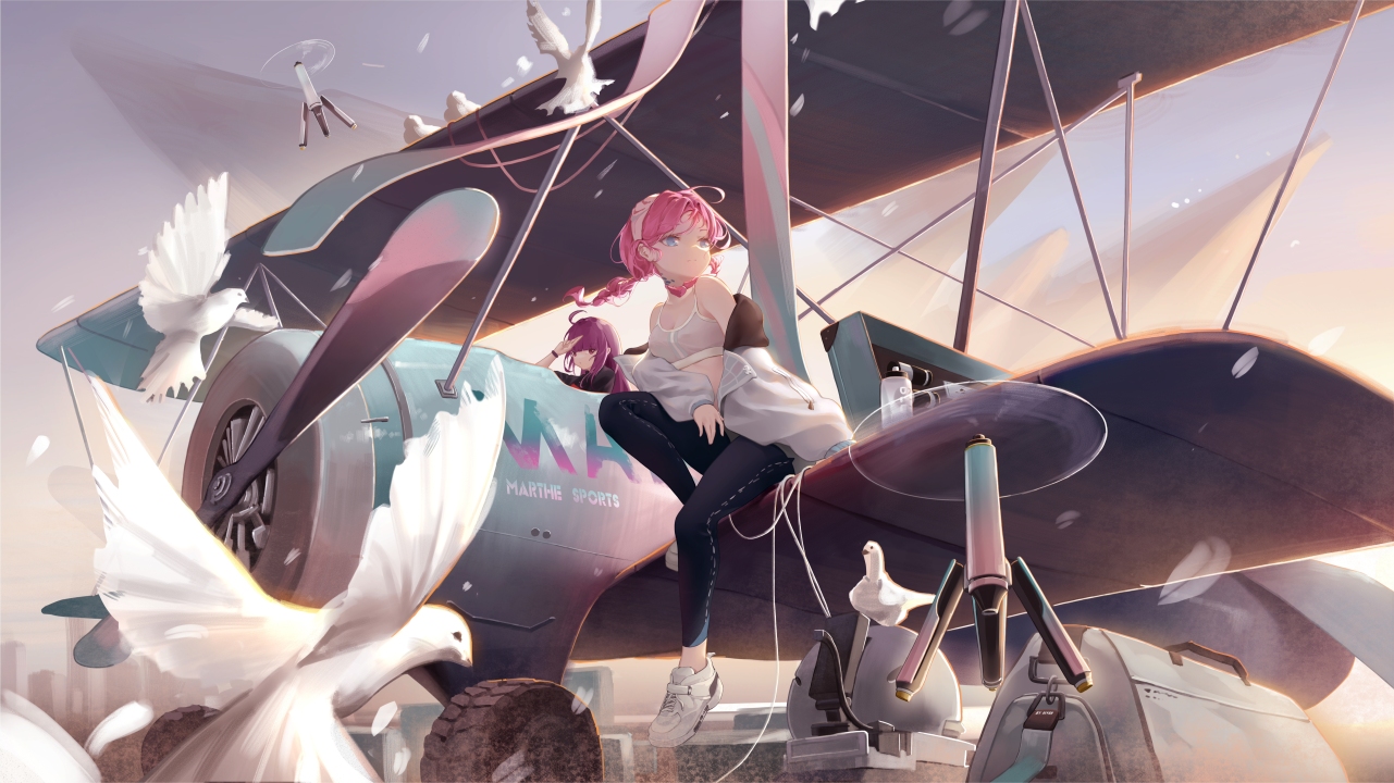 粉红色头发、动漫、女孩、AI艺术、肖像、明日方舟、飞机、鸽子、和平鸽