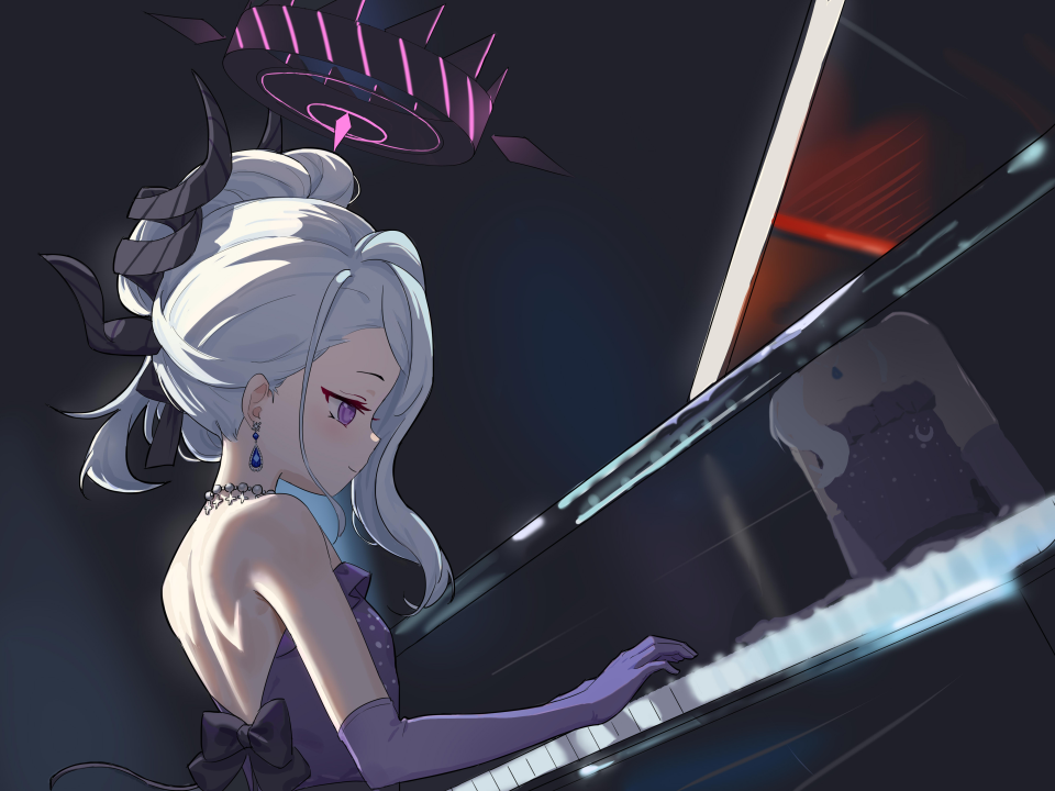 长发、蓝头发、动漫、钢琴、乐器、尖耳朵、鲜花、舞台、双胞胎、木材、连衣裙、灯光、舞台灯光、紫色眼睛、动漫女孩