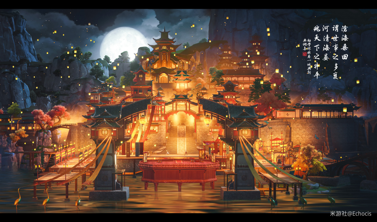 动画、屏幕截图、月亮、灯笼、元宵节、春节、山、中国建筑、汉字