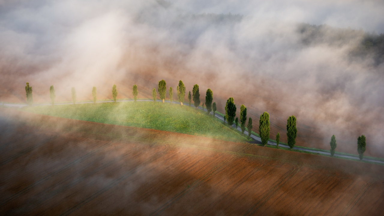 风景、田野、日出、薄雾、自然、花朵、树木、植物、阳光、户外
