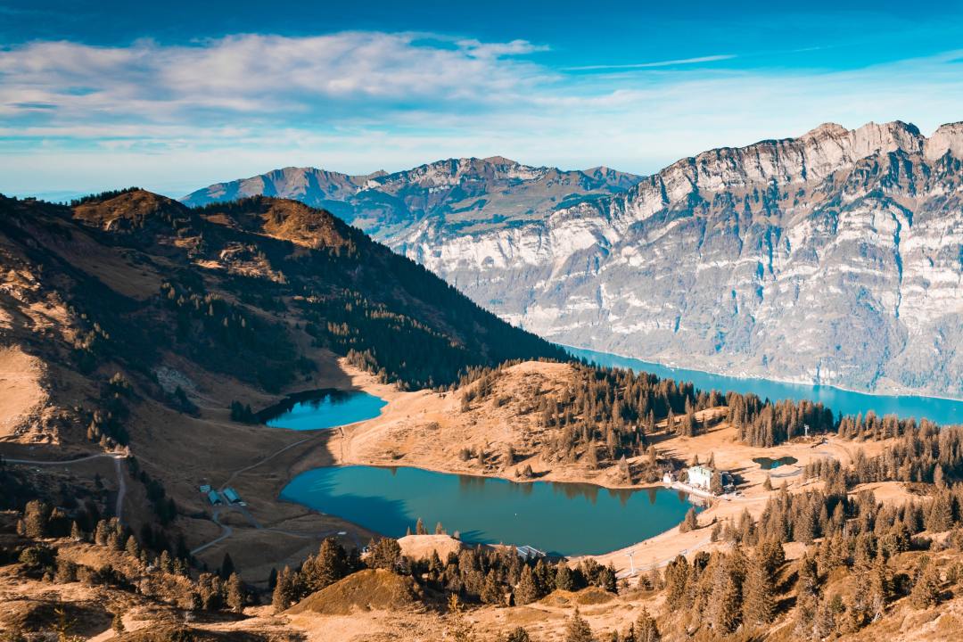 风景、山脉、湖泊、水、云、蓝色、森林、树木、鸟瞰