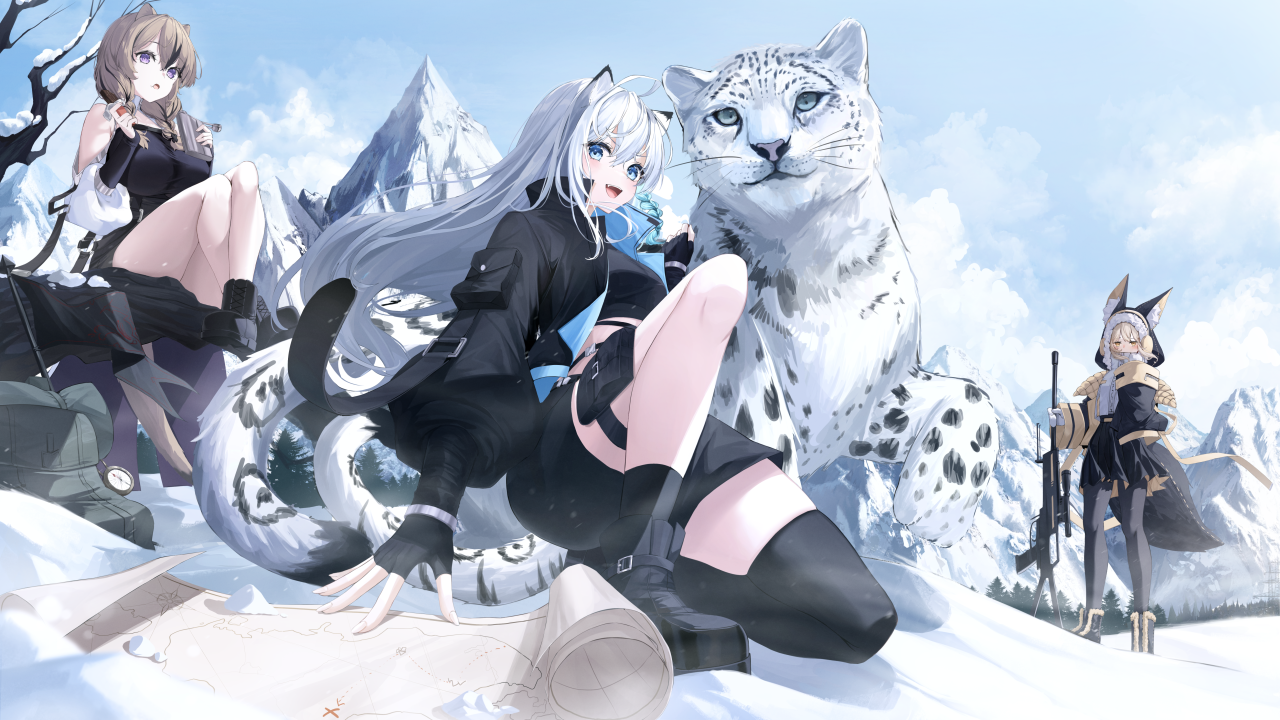 长发、女人、动漫、女孩、老虎、动物、雪、手套、天空、云、兽耳、大腿