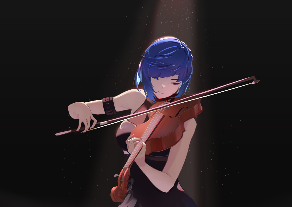 蓝头发、音乐家、小提琴、聚光灯、简单背景、黑色背景、叶兰、原神、电子游戏、女孩