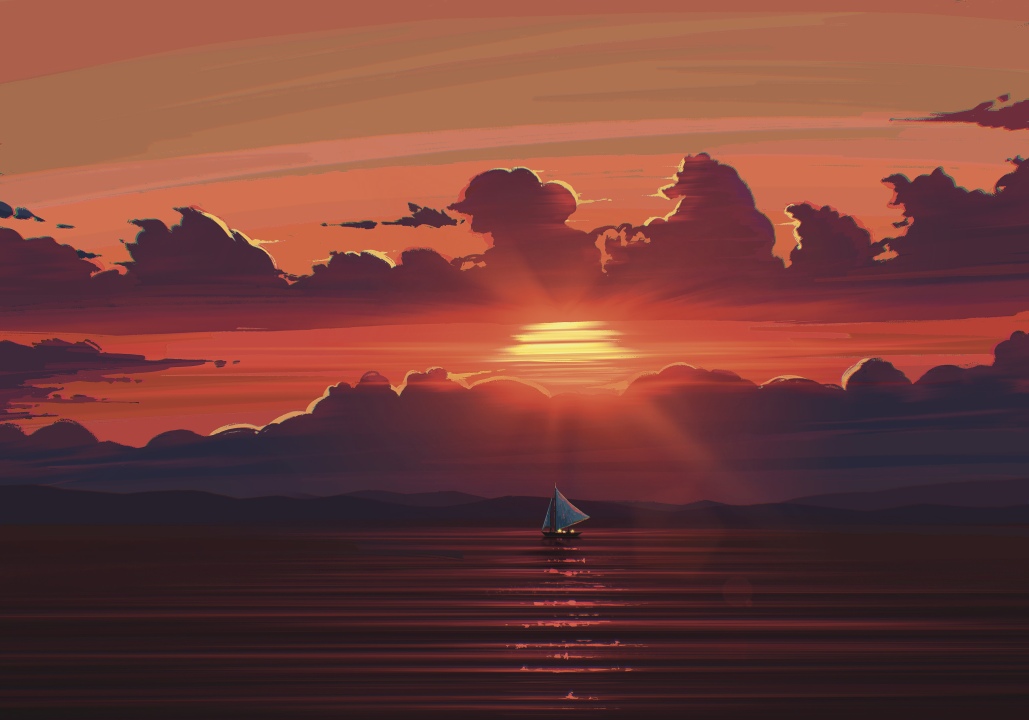 风景、艺术、海景、AI艺术、水、船、太阳、云、天空、波浪