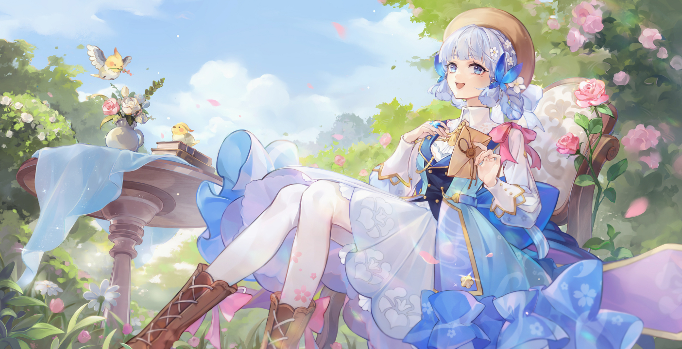 鼹鼠、泪痣、坐着、动漫、女孩、原神、连衣裙、龟里、花、帽子、树叶、天空、云、鸟、花瓶、椅子、字母、花瓣