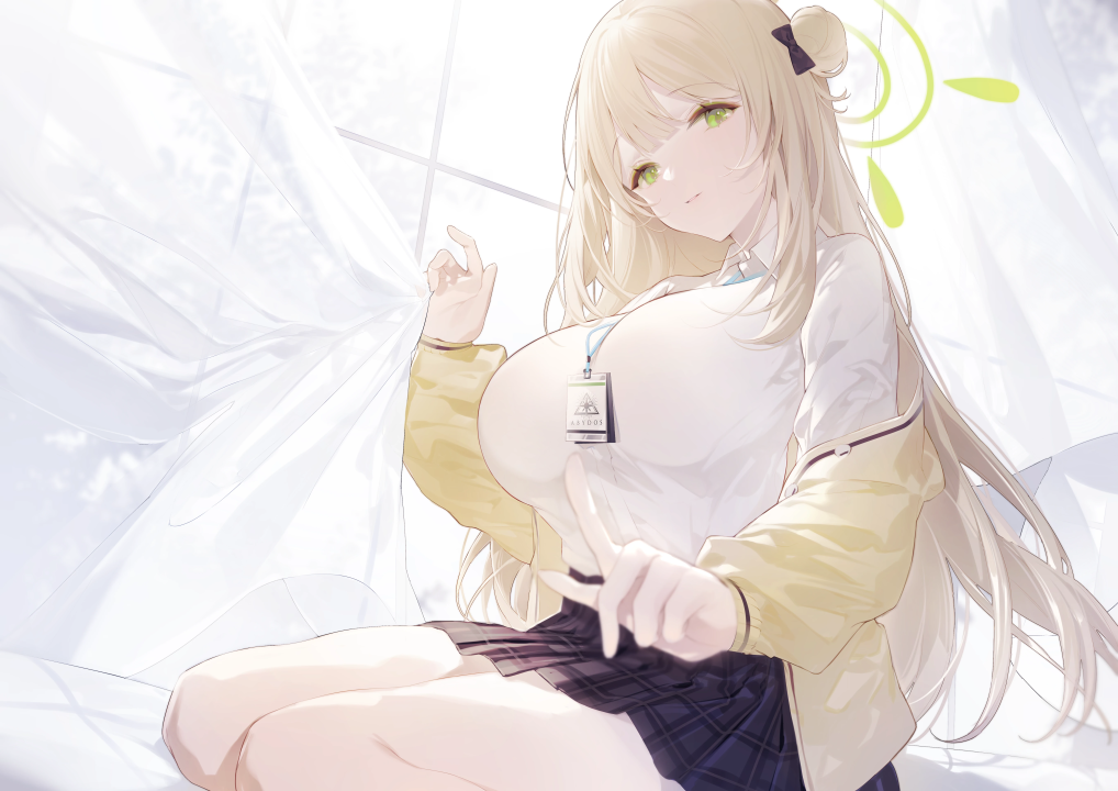 长发、金发、绿色眼睛、指点、发髻、动漫、女孩、蔚蓝档案、窗户、白色、窗帘