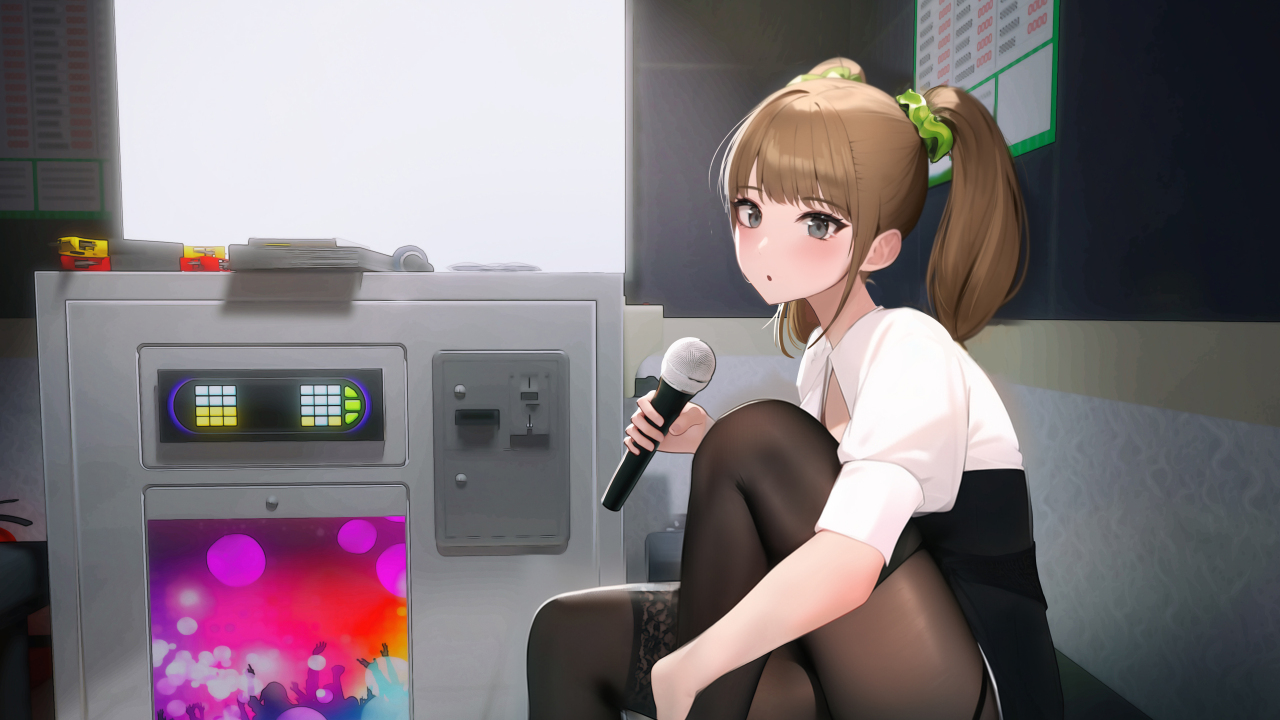 黑发、俊男、灰色眼睛、室内、女人、弯腿、坐着、动漫、女孩、麦克风、裤袜、双马尾