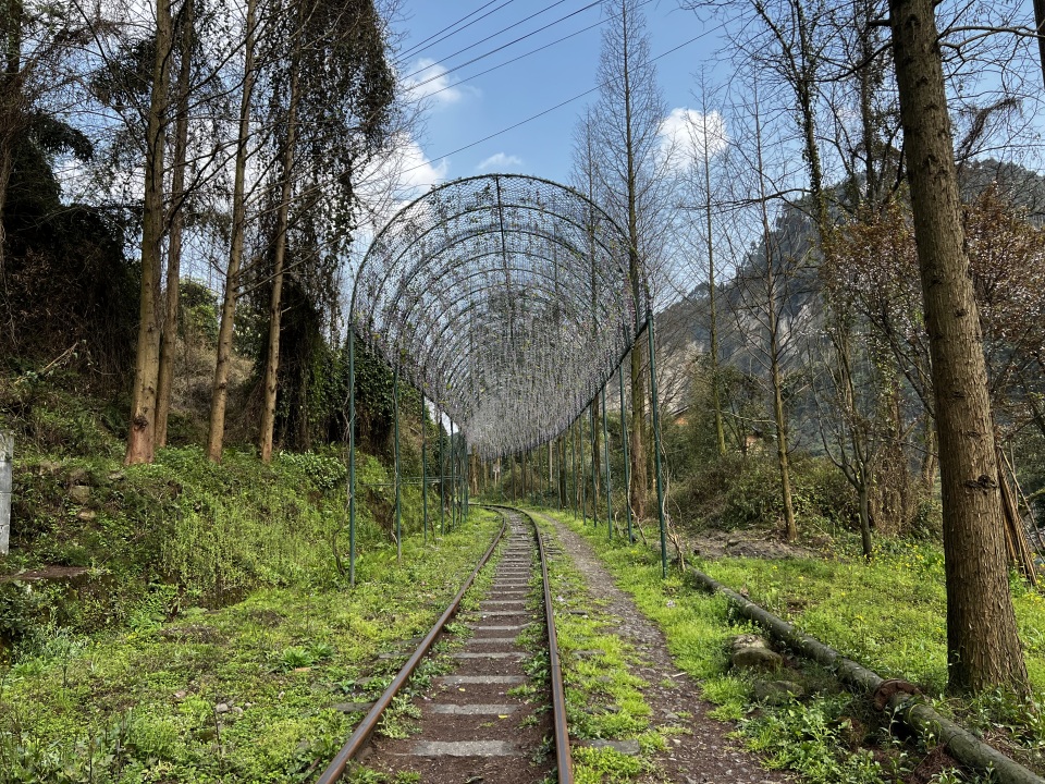 风景、山脉、树木、植物、桥梁、建筑、铁路、火车、机车、电力机、车、高架桥、稻草人