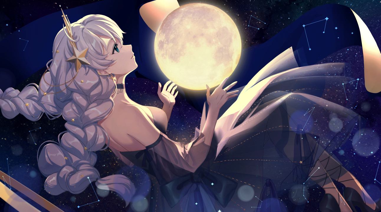 长发、辫子、动漫、动漫女孩、月亮、月光