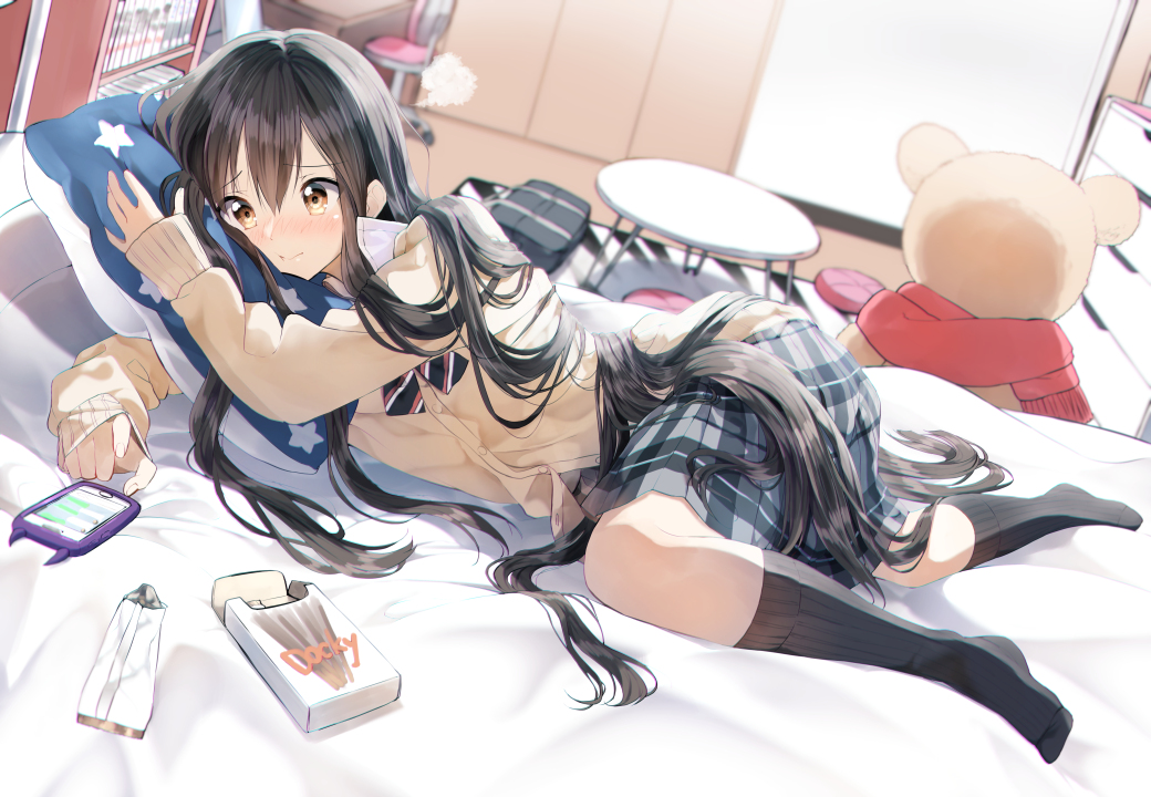 长发、铁路、校服、黑发、枕头、拥抱、害羞、脸红、棕色眼睛、动漫、女孩