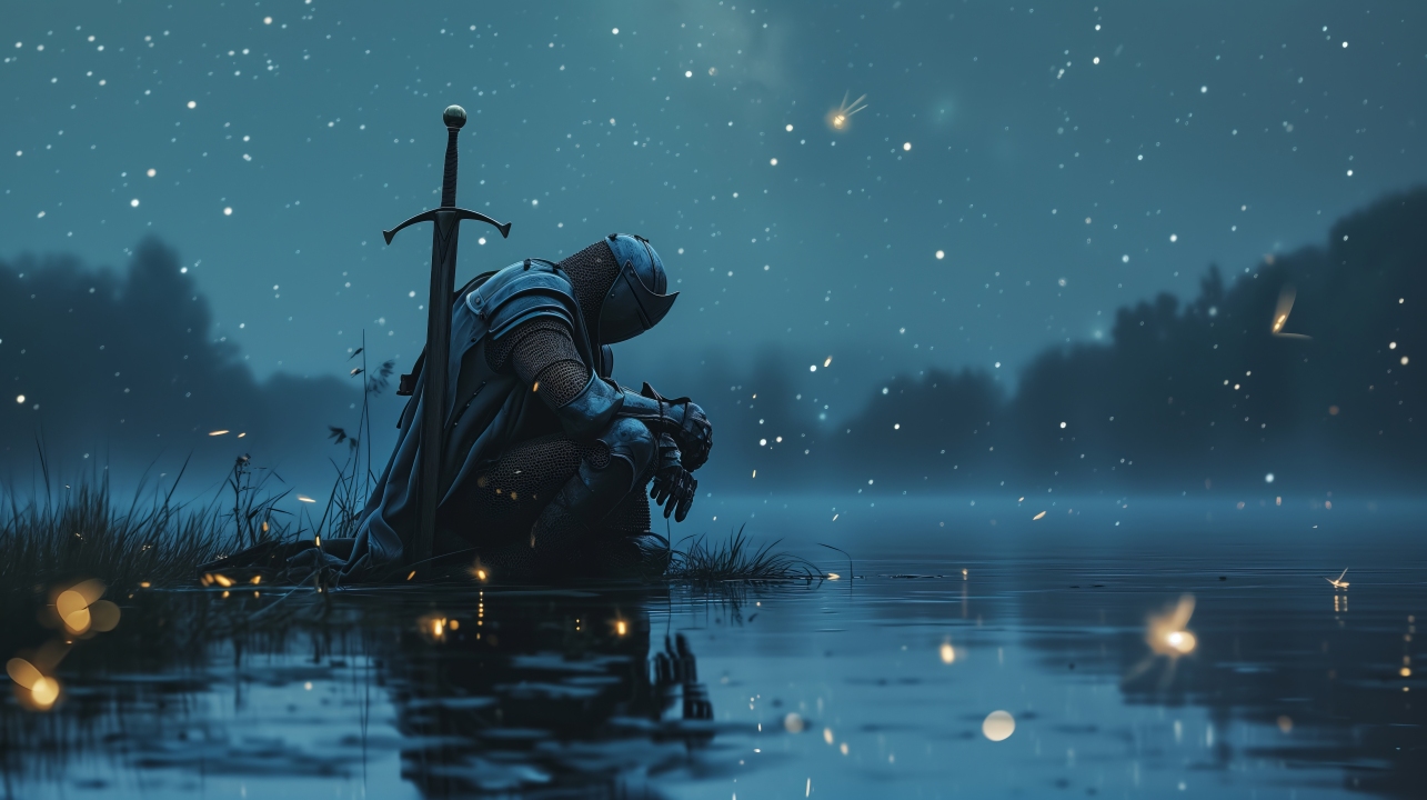 骑士、坐着、AI艺术、剑、萤火虫、湖、反射、蓝色