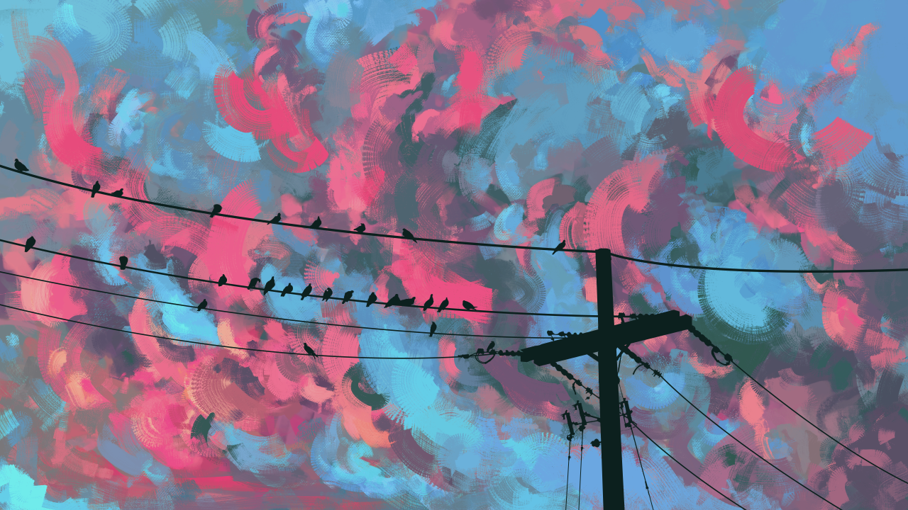 骨架、电线、黎明、鸟类、山脉、数字艺术、电线杆