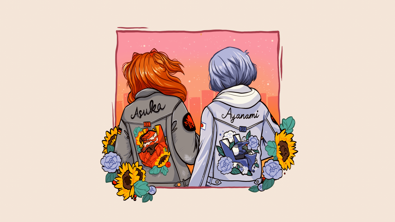 两个角色背对背,一个红发一个蓝发,背景是粉色天空和向日葵。