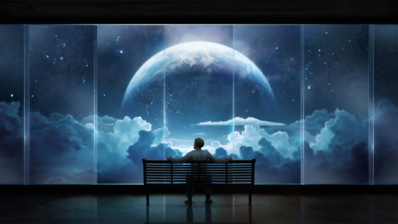 空间云、太空逃生、蓝色、男人、科幻、遥望星空
