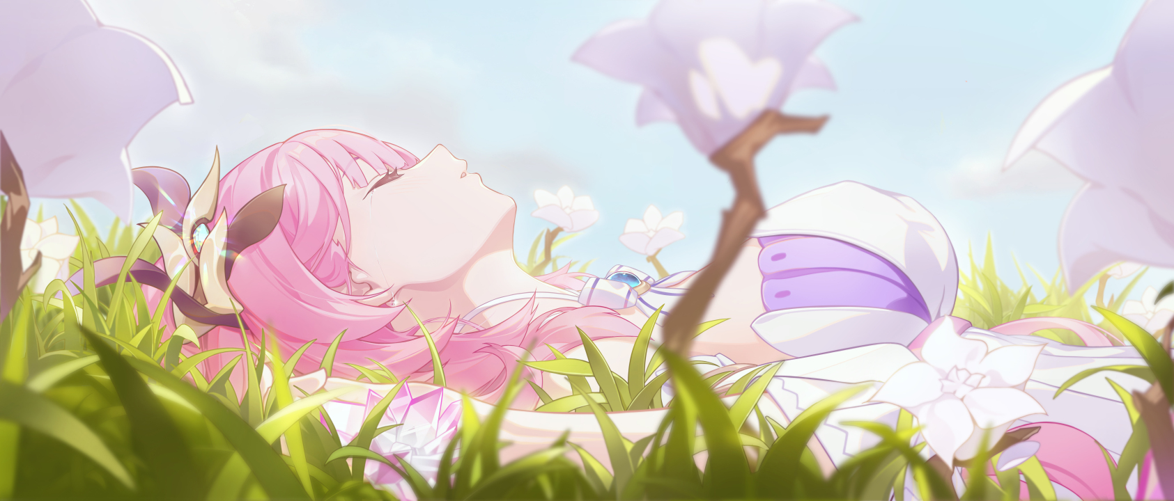 粉色头发、泪水、仰卧、闭眼、侧面、原神、图片、动漫、女孩、哭泣、领结、连衣裙、白色连衣裙、鲜花、草