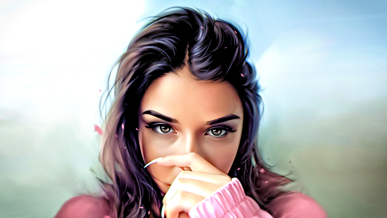 面部、长发、女性、肖像、AI艺术、原图、绘画、正面视图、白色背景、简单背景、逼真、特写、棕色眼睛