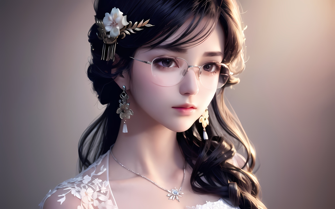 艾冬冬、亚洲、女人、长发、眼镜、耳环、项链、珠宝、简单背景