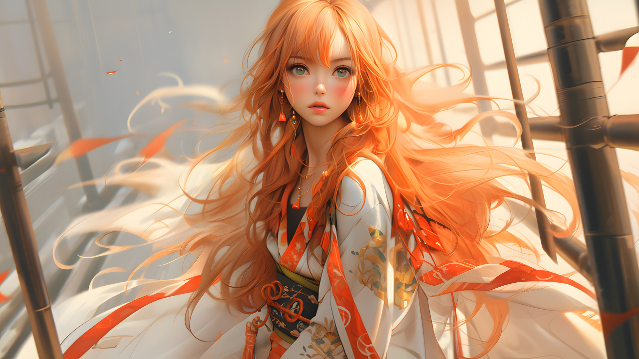 女人、红发、长发、服装、AI艺术、阳光、耳环、项链、腮红