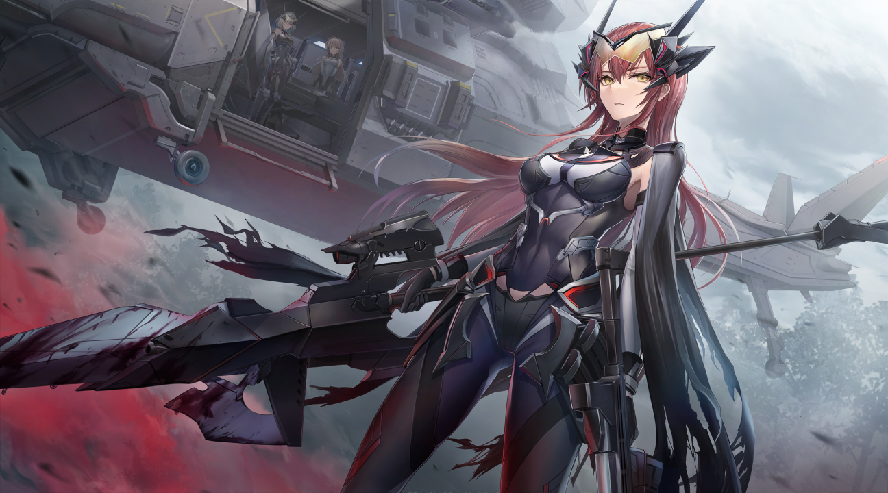 站立、长发、红发、动漫、动漫女孩、黄眼睛、汽车、紧身衣、直升机、武器