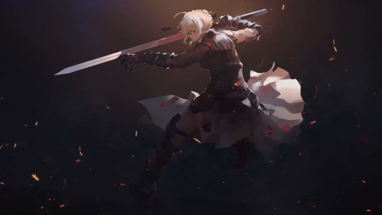 盔甲、女孩、奇幻、蓝眼睛、金发、动漫、奇幻艺术、小鸟、命运系列、军刀、命运、零、剑、衣服、楼梯