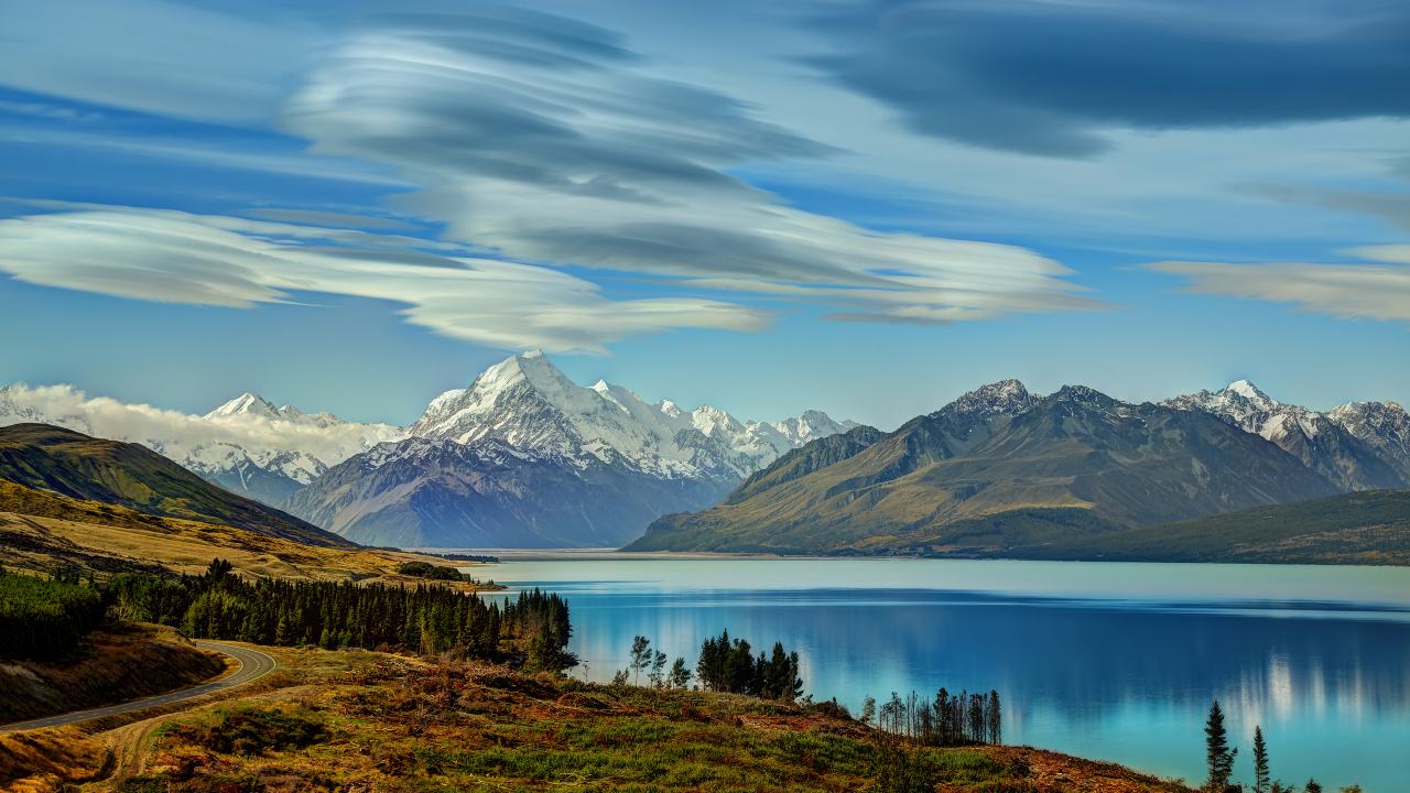 摄影、风景、新西兰、自然、山脉、雪、天空、水、云、树、路