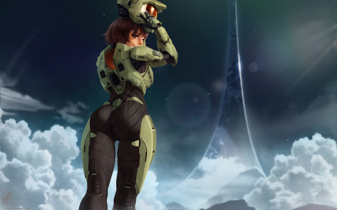 大师、光环、马尾辫、女人、游戏、空间、绿色、盔甲、眨眼、头盔、云、AI艺术、游戏CG