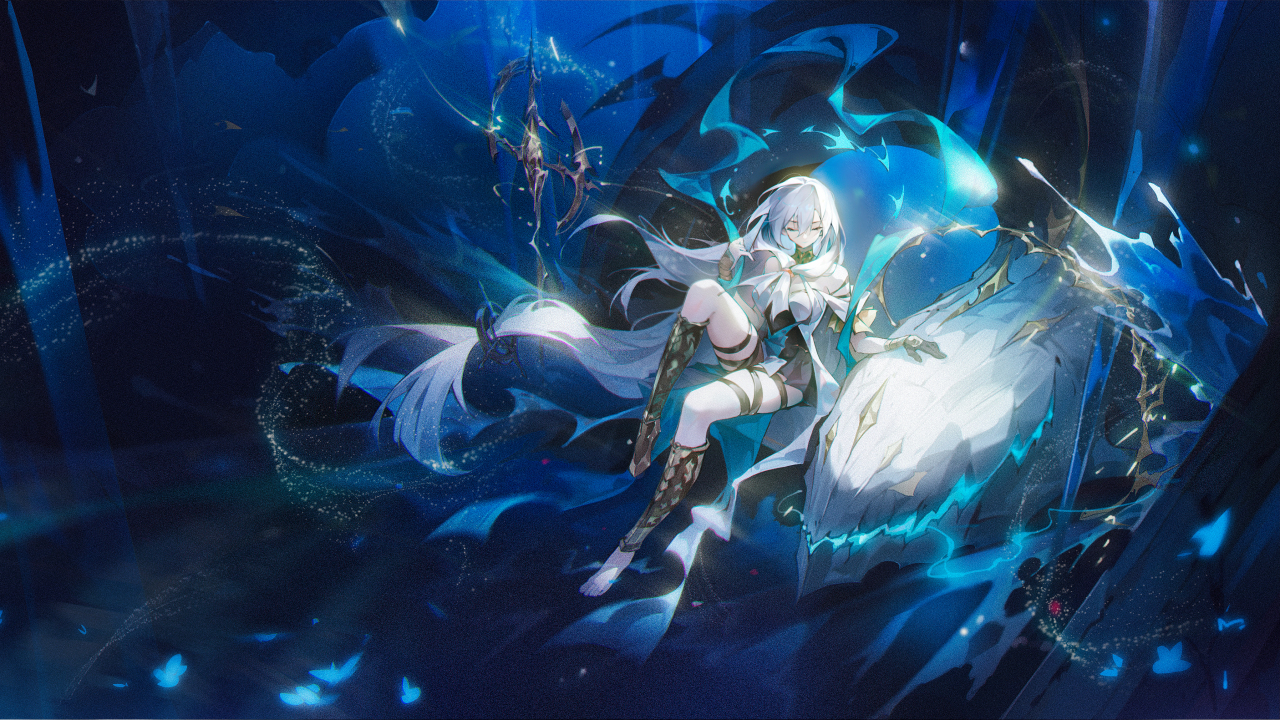 蓝发、长发、闭眼、原神、动漫、女孩、头饰、图书馆、书籍、兽耳
