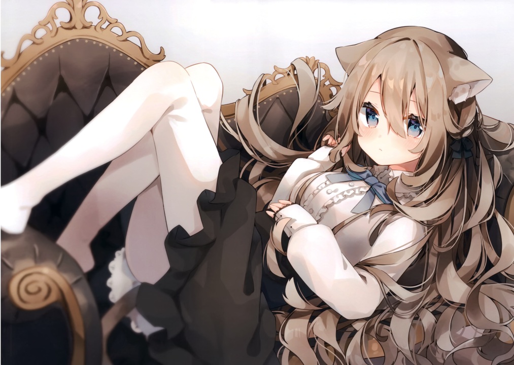猫女孩、长发、动漫、动漫女孩、白色连裤袜、褶皱连衣裙