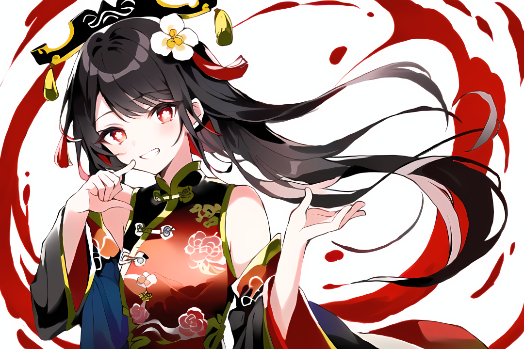 胡桃、原神、红眼睛、动漫女孩、黑发、中国服饰、头发、花