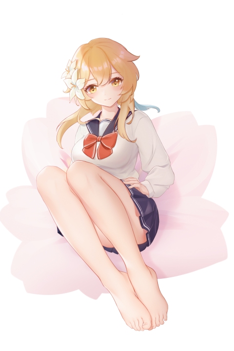 金发女郎、独唱、原神、裙子、露明、动漫女孩、黄眼睛、校服、头发里的花