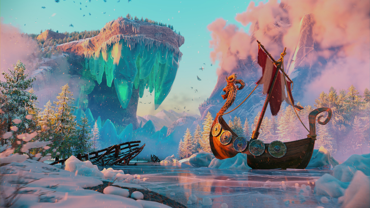 数字艺术、艺术品、冬天、帆船、北欧海盗、冰冻的湖、霜冻、雪景、湖泊、毒牙、烟、树、森林、奇幻艺术、洞穴、想象、水、船舶、冰