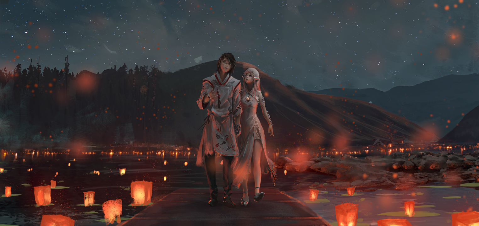 情侣、白发、行走、异色、牵手、艺术品、数字艺术、奇幻艺术、插图、山、树木、湖、岩石、纸灯笼、恶魔角、角、灯笼、夜、天空、水