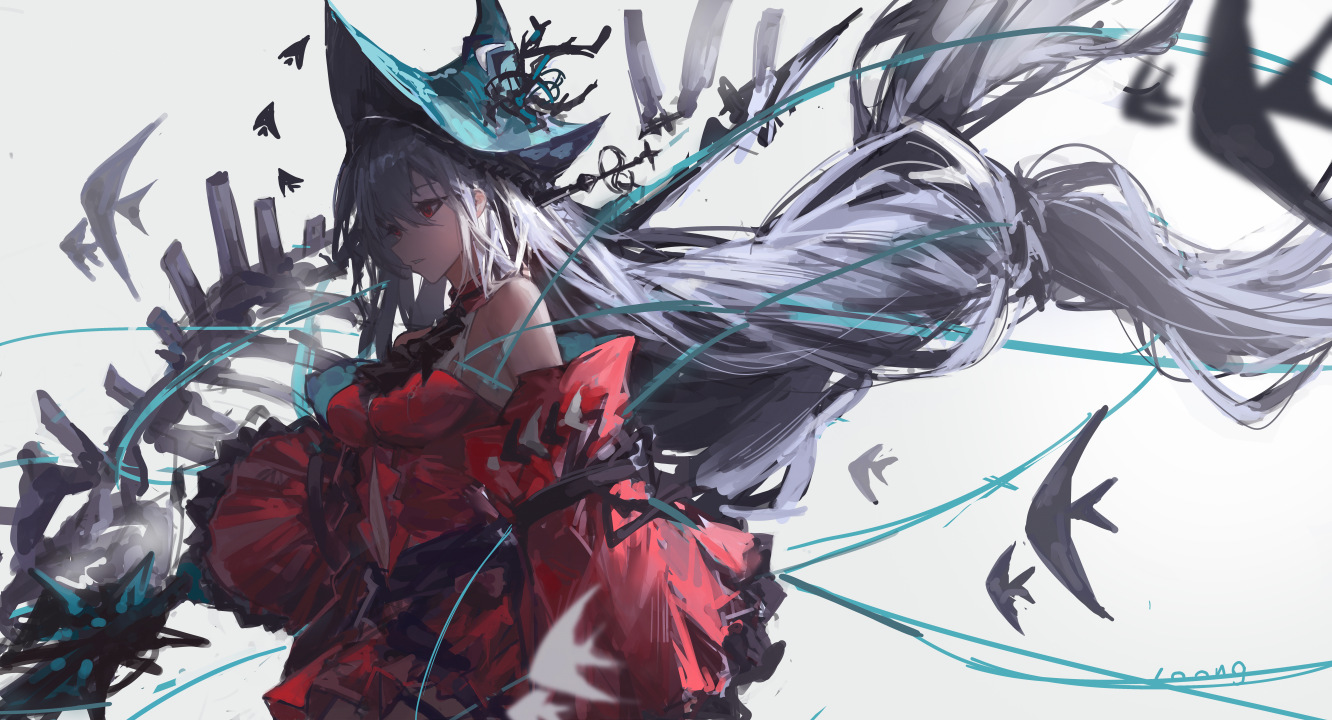 长发、红眼睛、骑士、斯凯德、动漫、女孩、银发、帽子、连衣裙