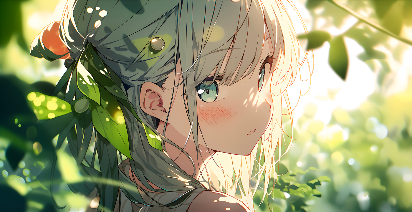 长发、艺术、树叶、绿色背景、柔光、动漫女孩、脸红、可爱
