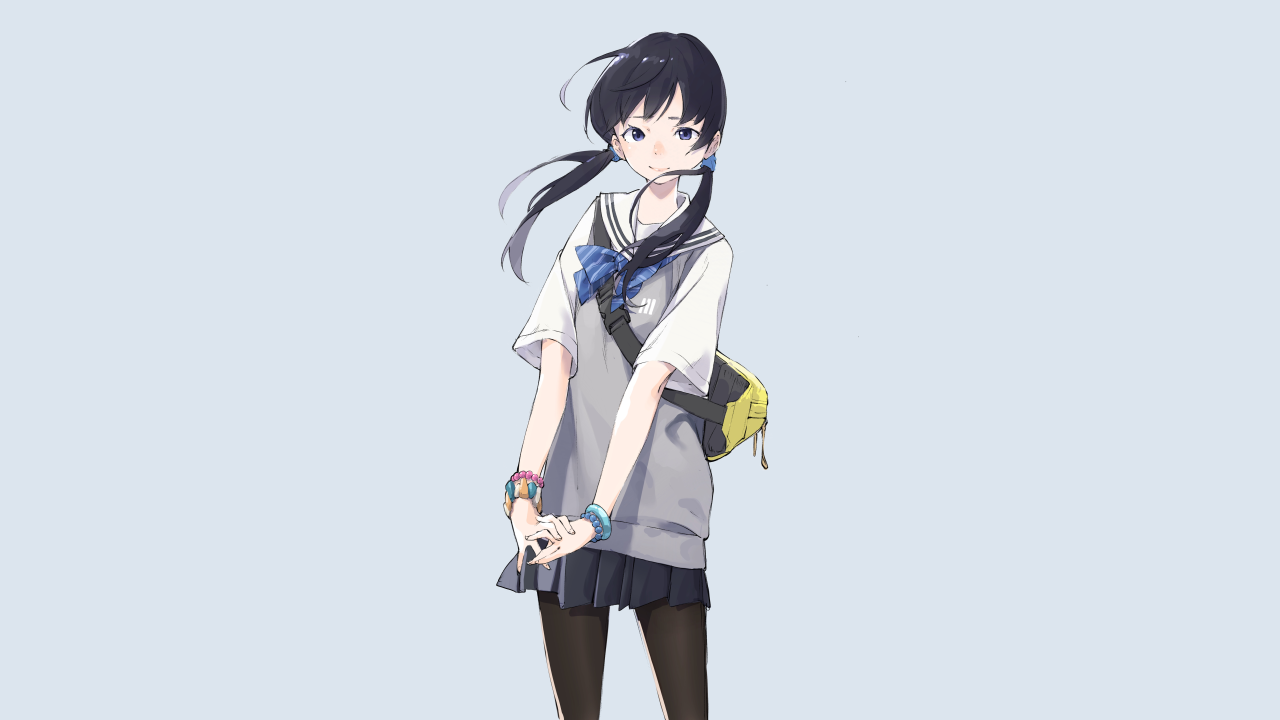 微笑、女学生、原创人物、长发、动漫女孩、动漫、简单背景、校服、领结、手镯、背包、绘画