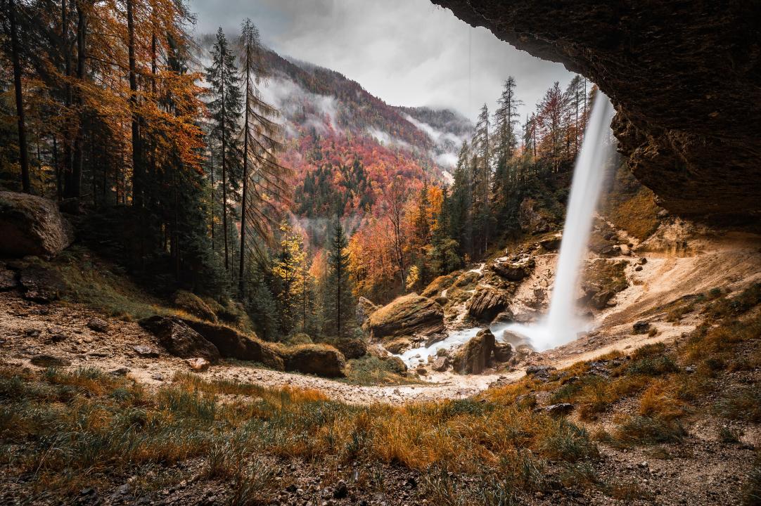自然、风景、森林、瀑布、洞穴、雾、云、秋天