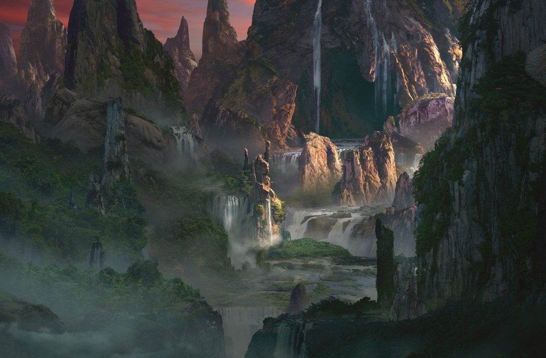 风景、瀑布、岩石、绘画、概念设计、艺术