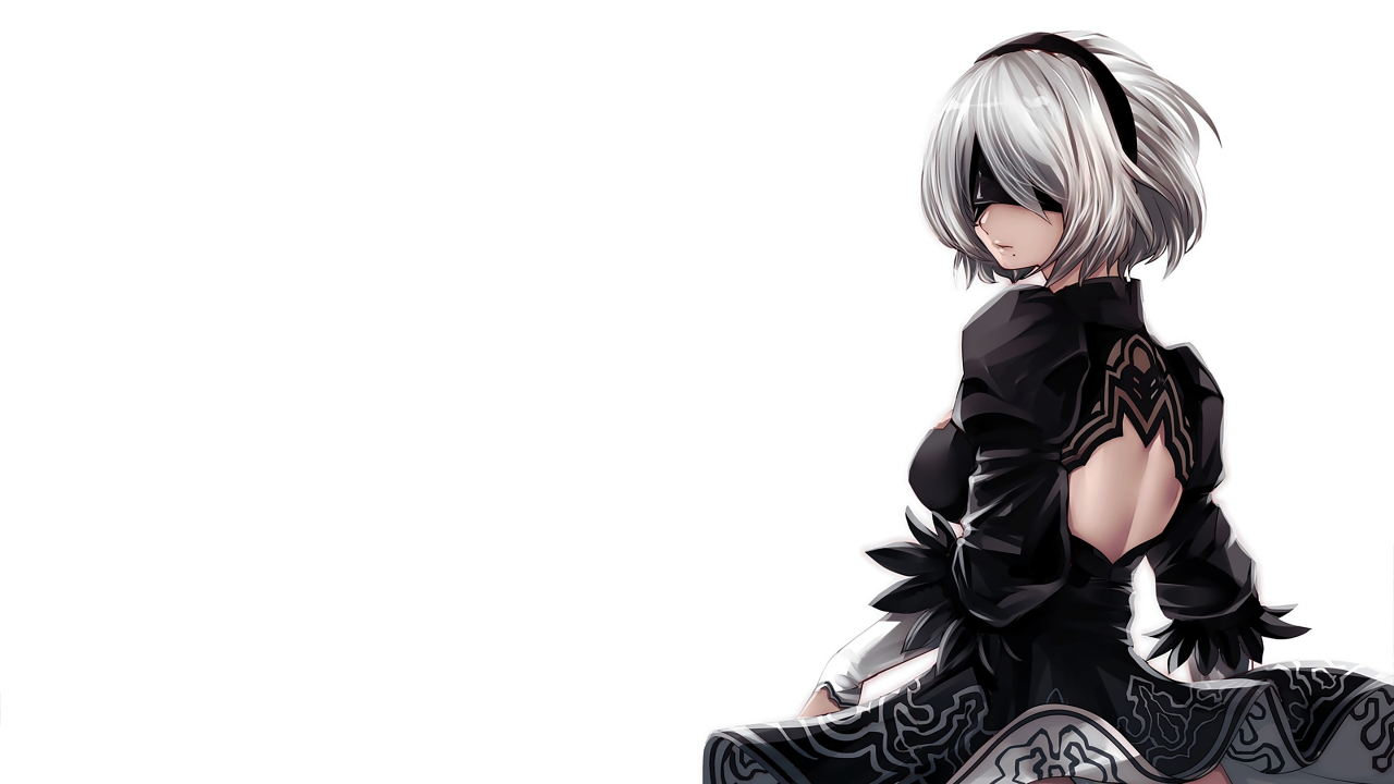 尼尔、Automata、蒙眼、痣、短发、背部、电子、游戏、女孩、站立、回头、蒙住眼睛、简单背景、白色背景、连衣裙、动漫、头带