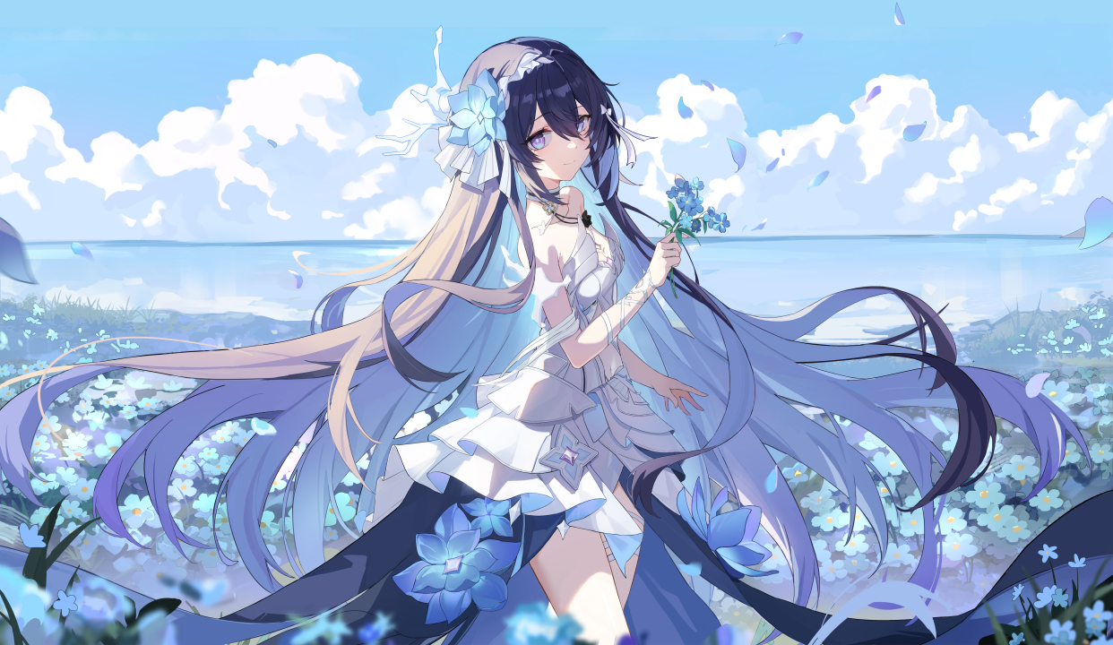 长发、站立、动漫、女孩、天空、云、花、衣服、花瓣、水、树叶、项链