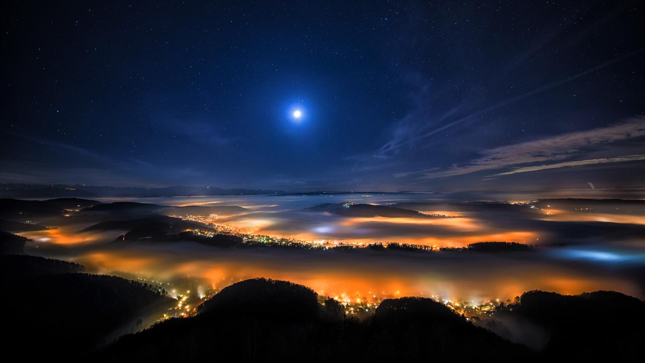 风景、自然、山脉、树木、夜、月亮、河流、雾、雪、星夜、月光、满月、星星、雪山