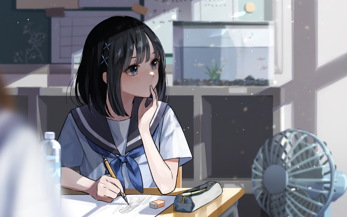 刘海、深色头发、动漫、女孩、写作、棕色眼睛、教室、运动衫