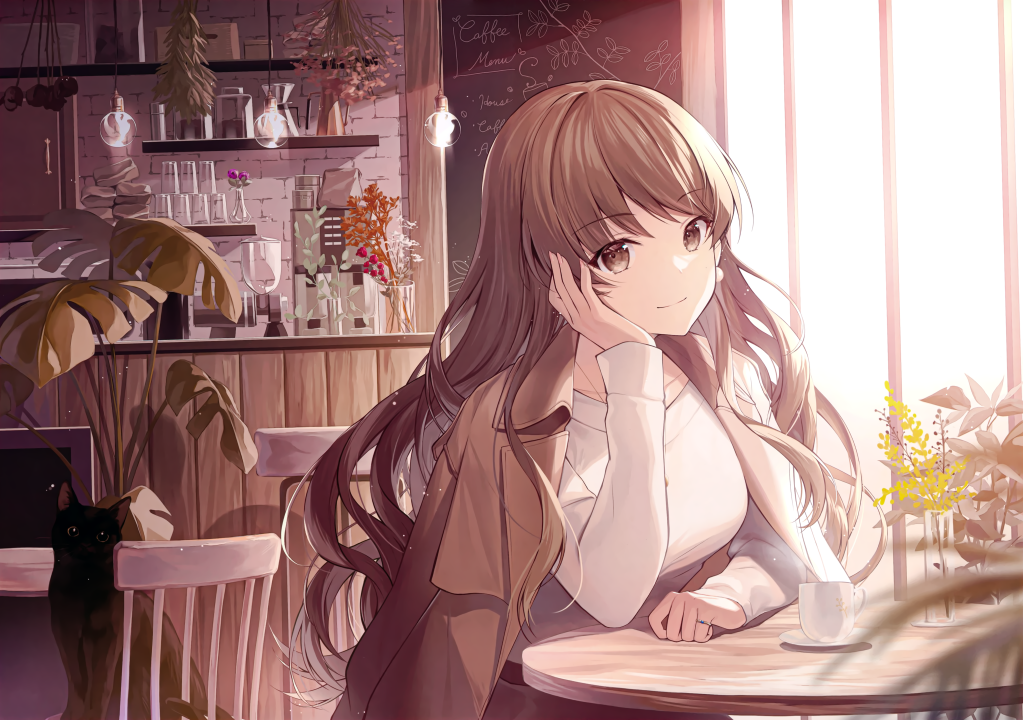 黑发、棕色眼睛、动漫、女孩、咖啡馆、猫
