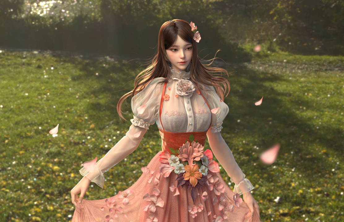 幻想女孩、女性、数码艺术、花卉、樱花、连衣裙