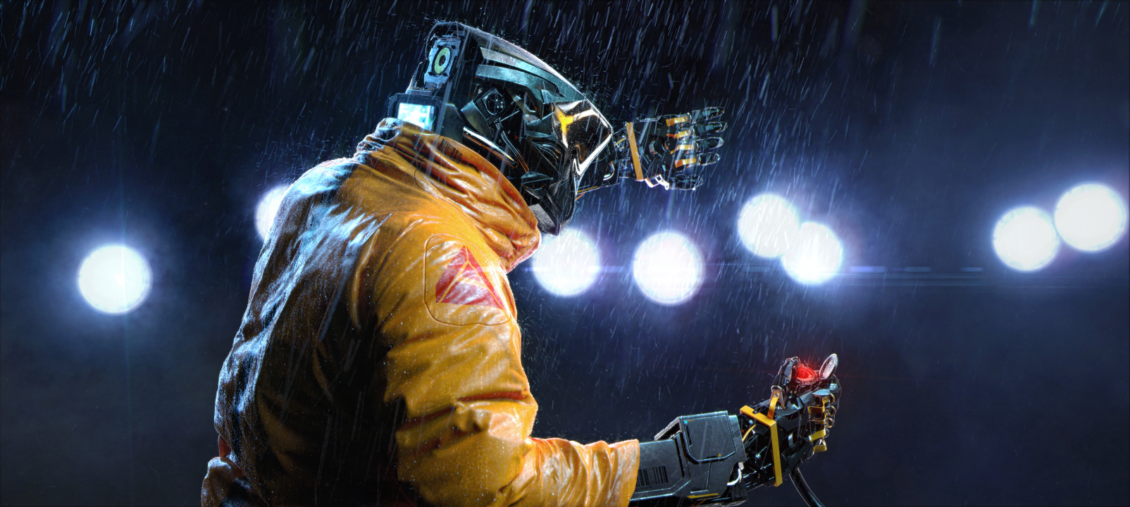 机器人、未来主义、夹克、夜晚、灯光、雨、科幻、AI艺术、现实主义、赛博朋克、超宽